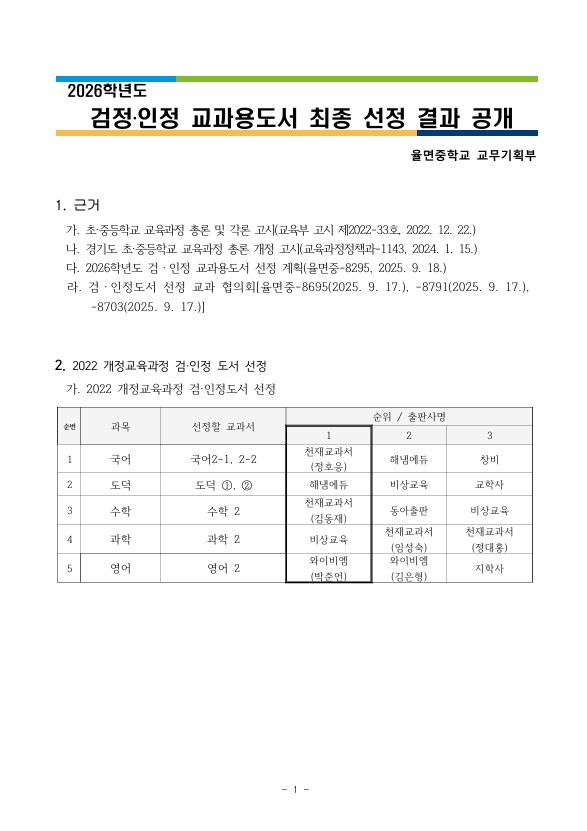 2026학년도 검임정 교과용 도서 최종 선정 결과